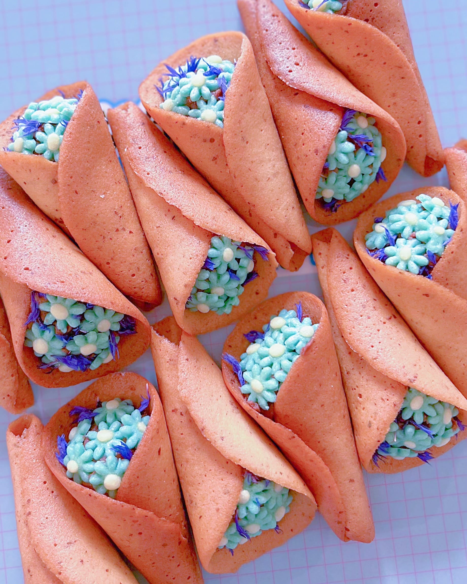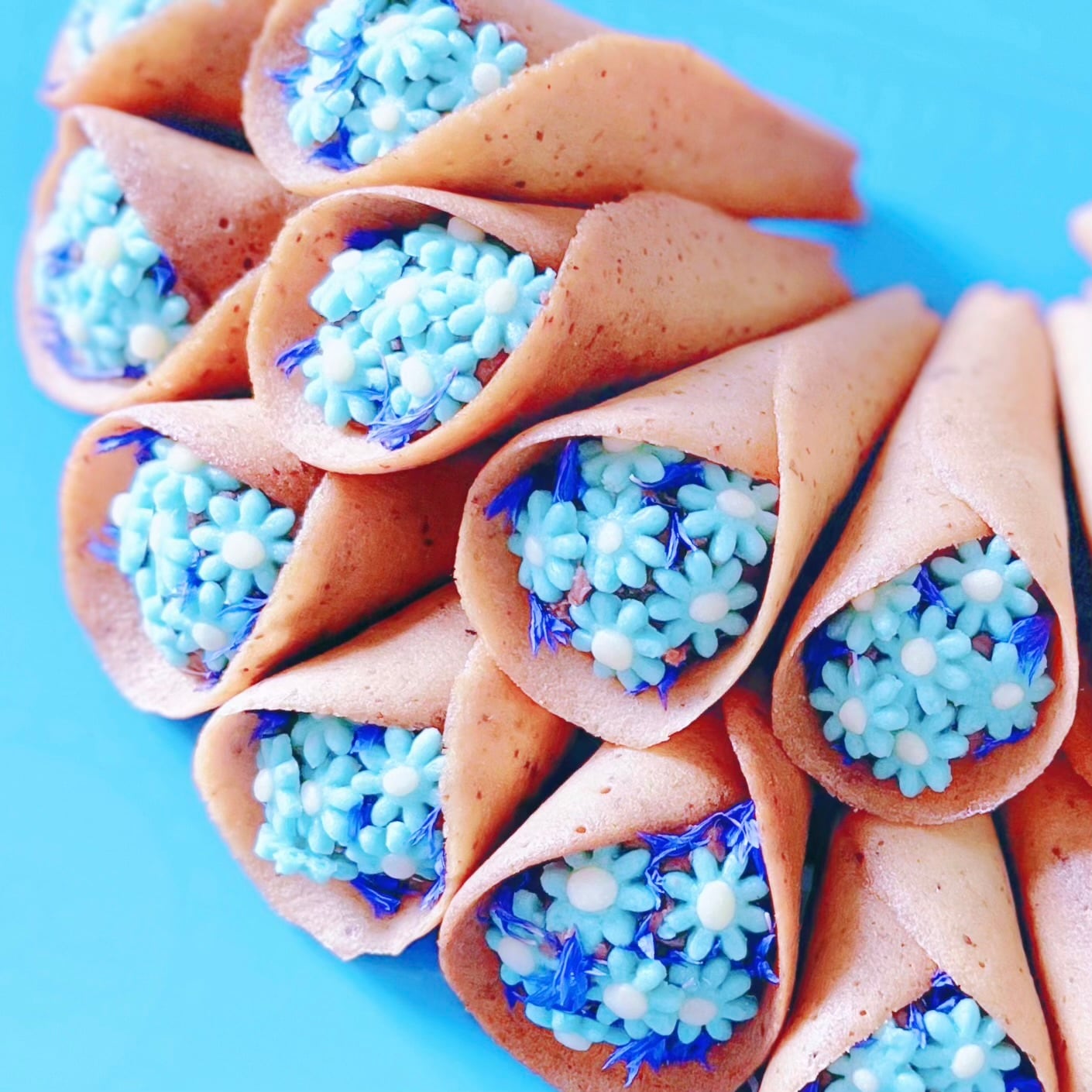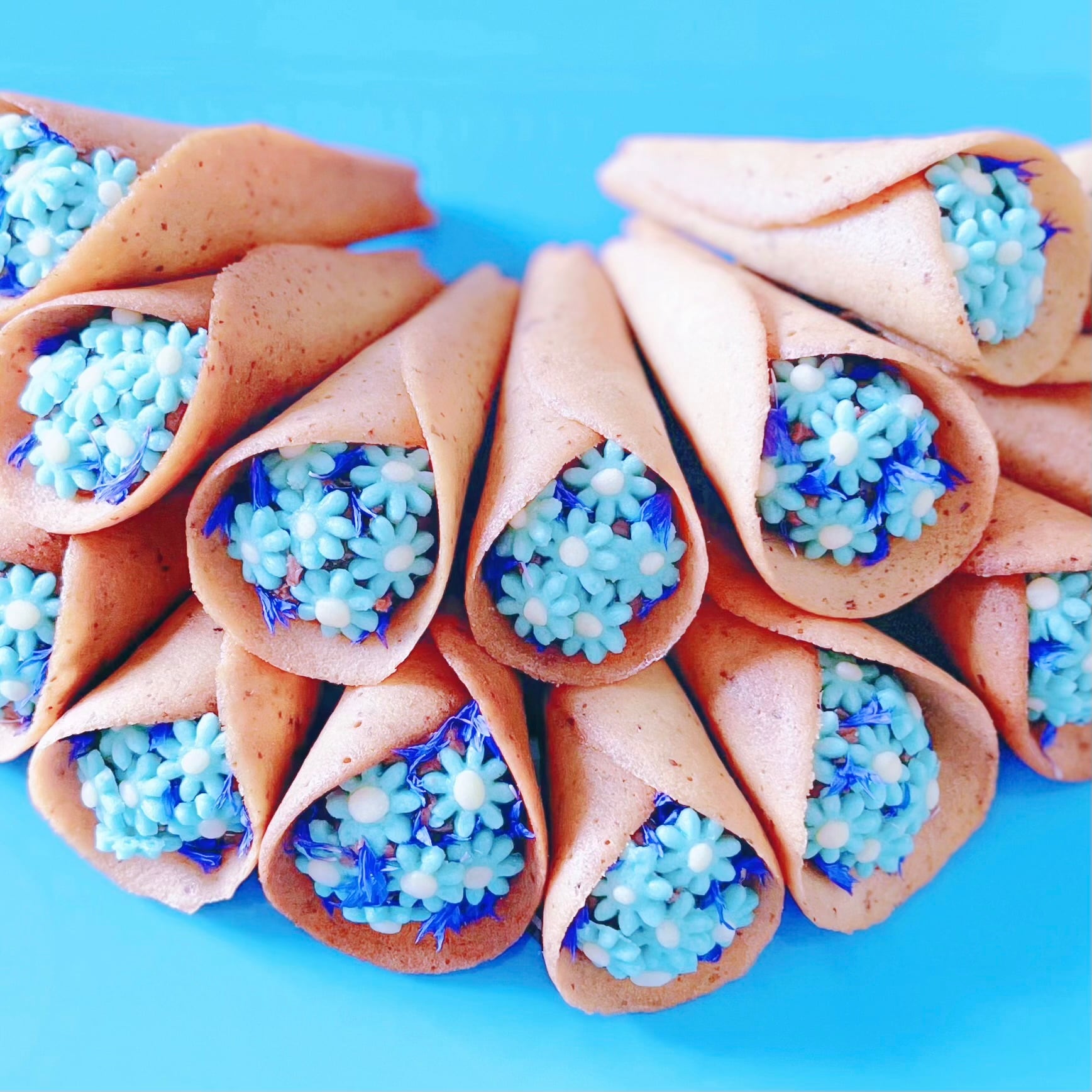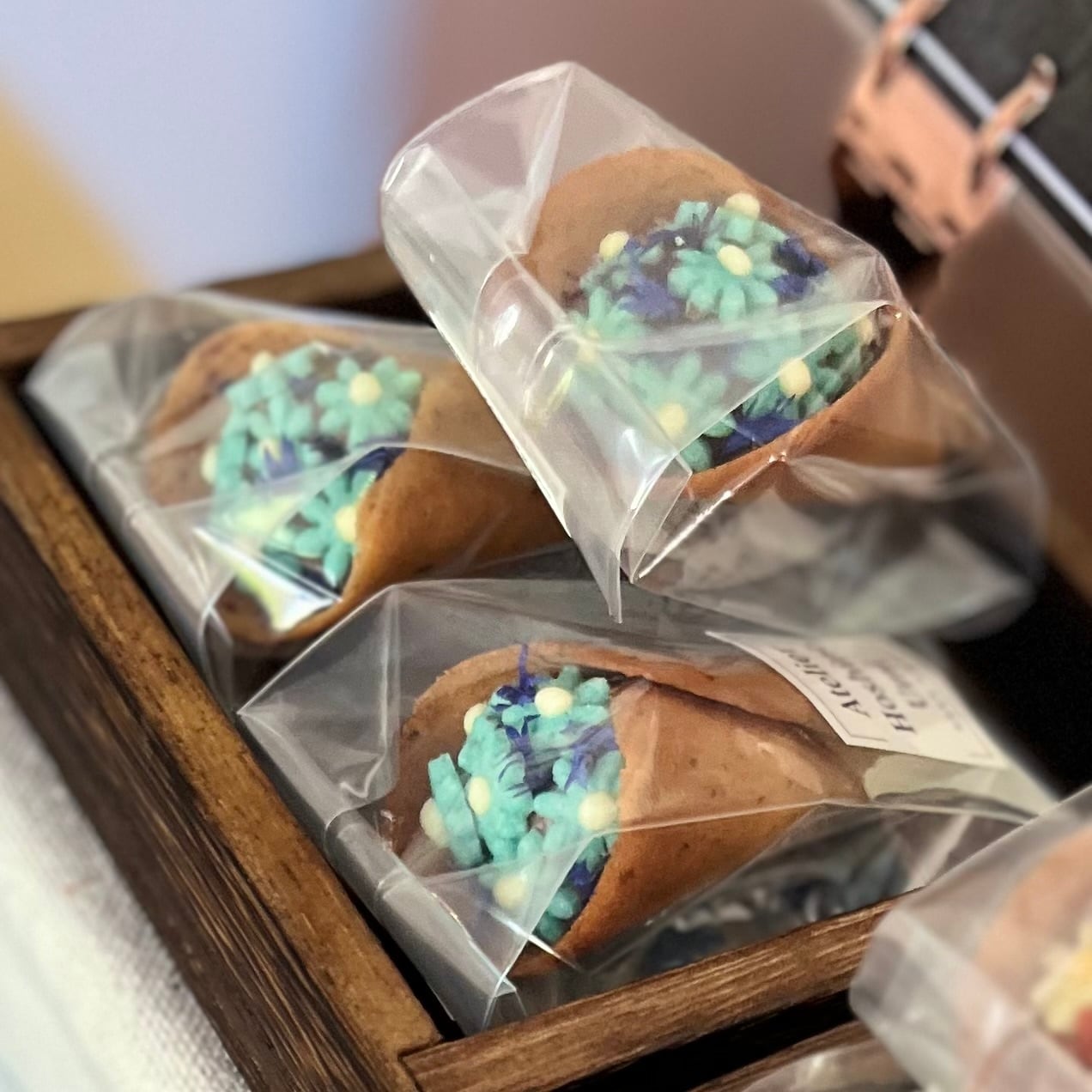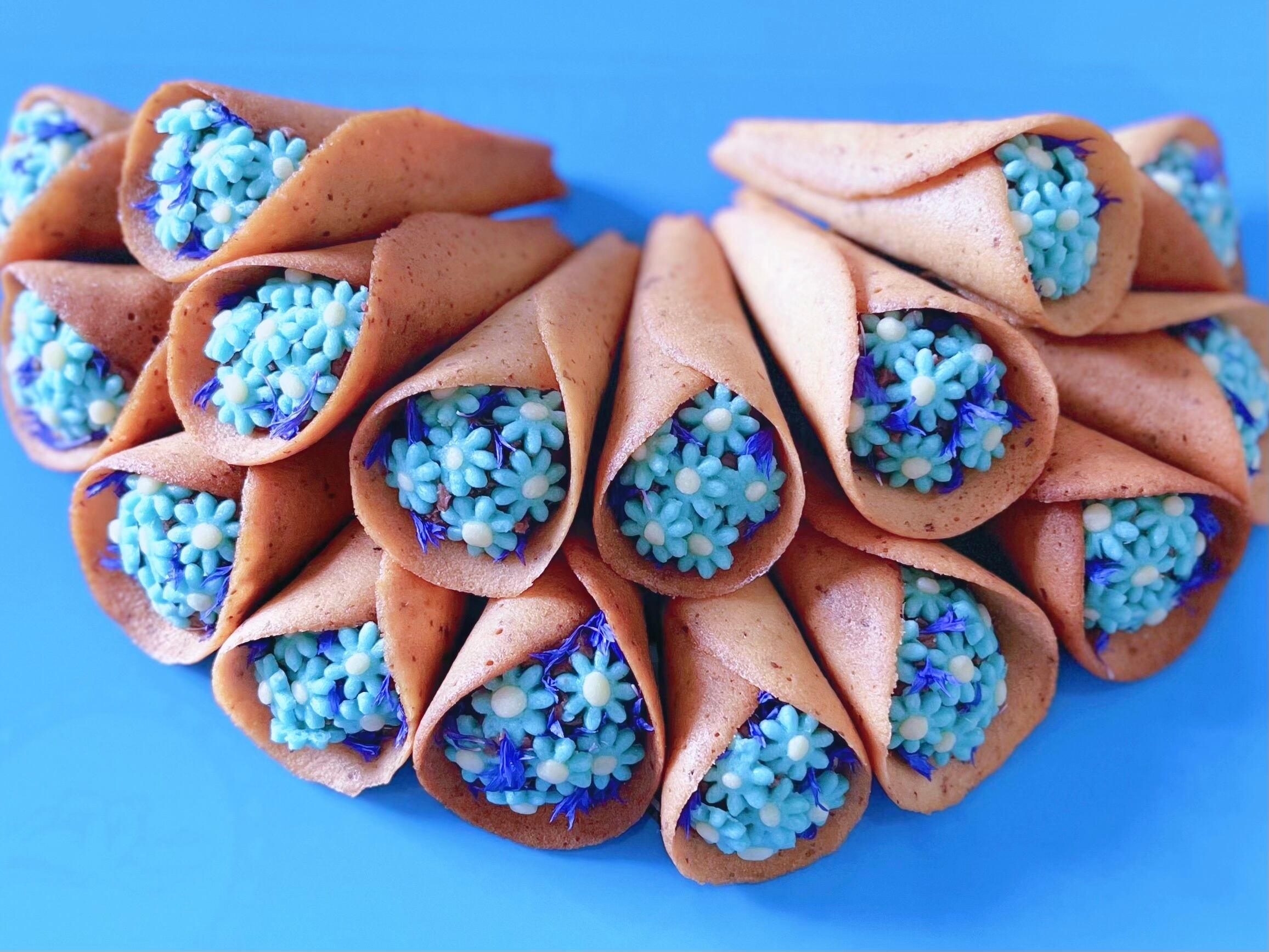 外側はラングドシャ、飾りは青いお花クッキーと青いドライエディブルフラワー(天然食用花)を使用しています。