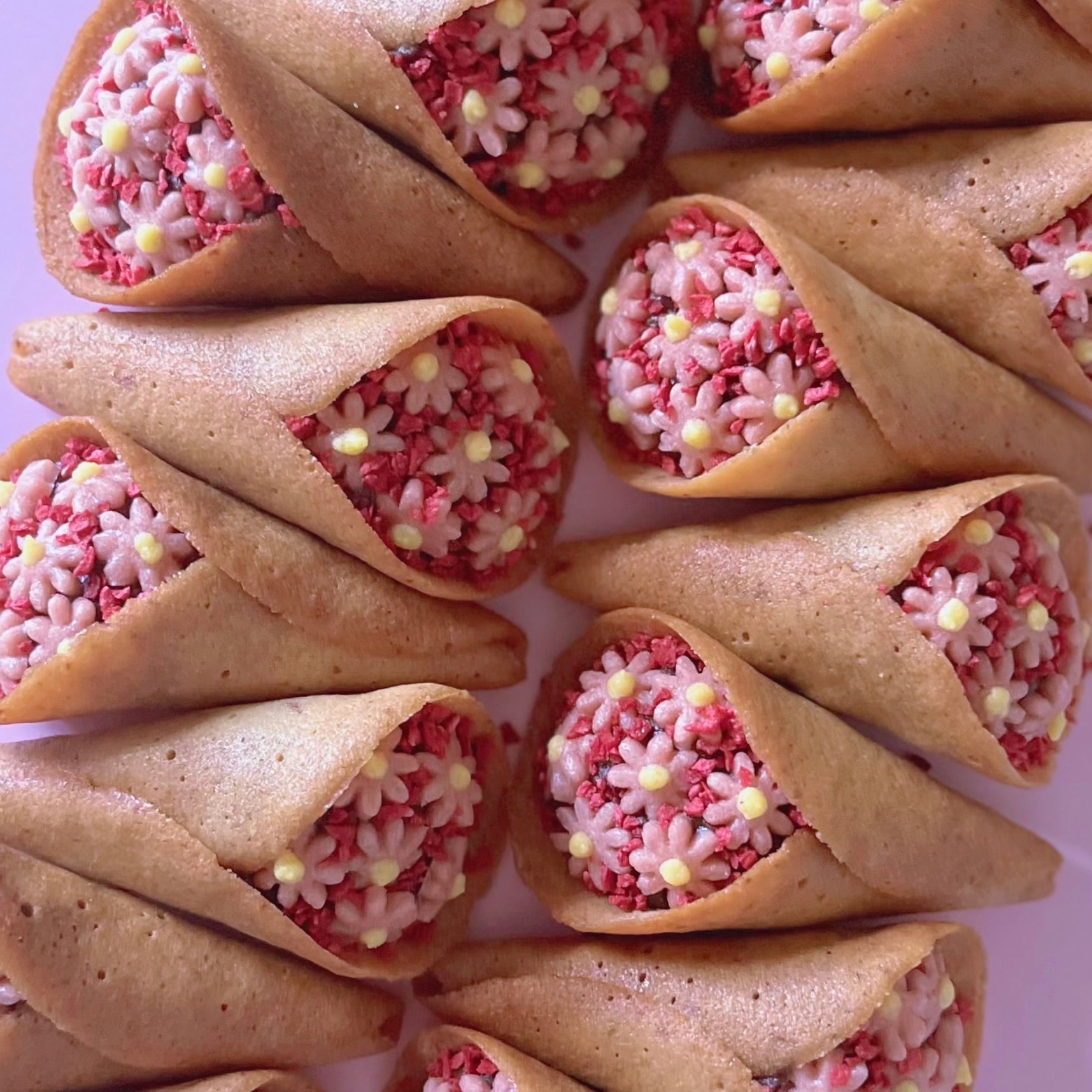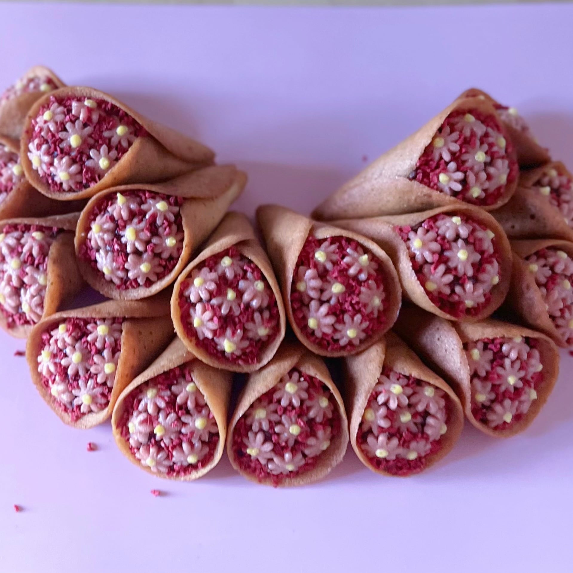 外側はラングドシャ、飾りは赤いお花クッキーとドライラズベリーで飾っています。