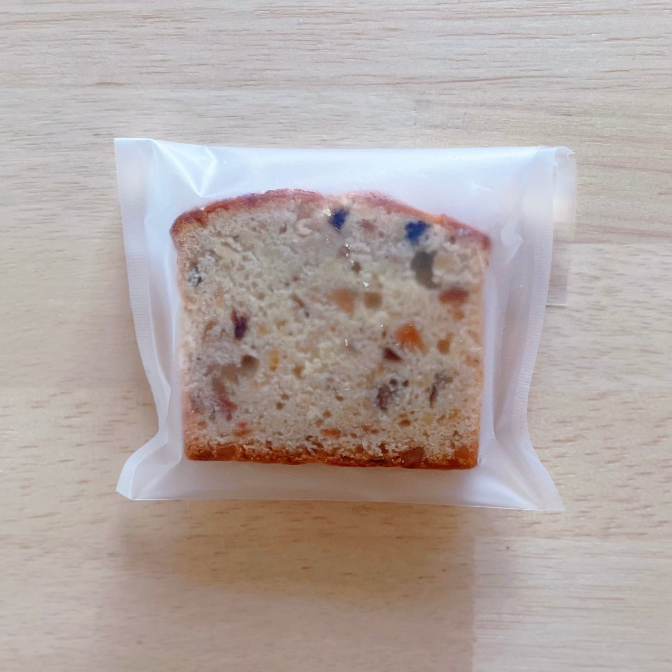 発酵バター、小麦粉(国産)、砂糖、ドライフルーツラム酒漬け(レーズン、イチジク、オレンジ、ドレンチェリー、パイン)卵、胡桃、アーモンドパウダー、ラム酒、ブランデー、ベーキングパウダー、
