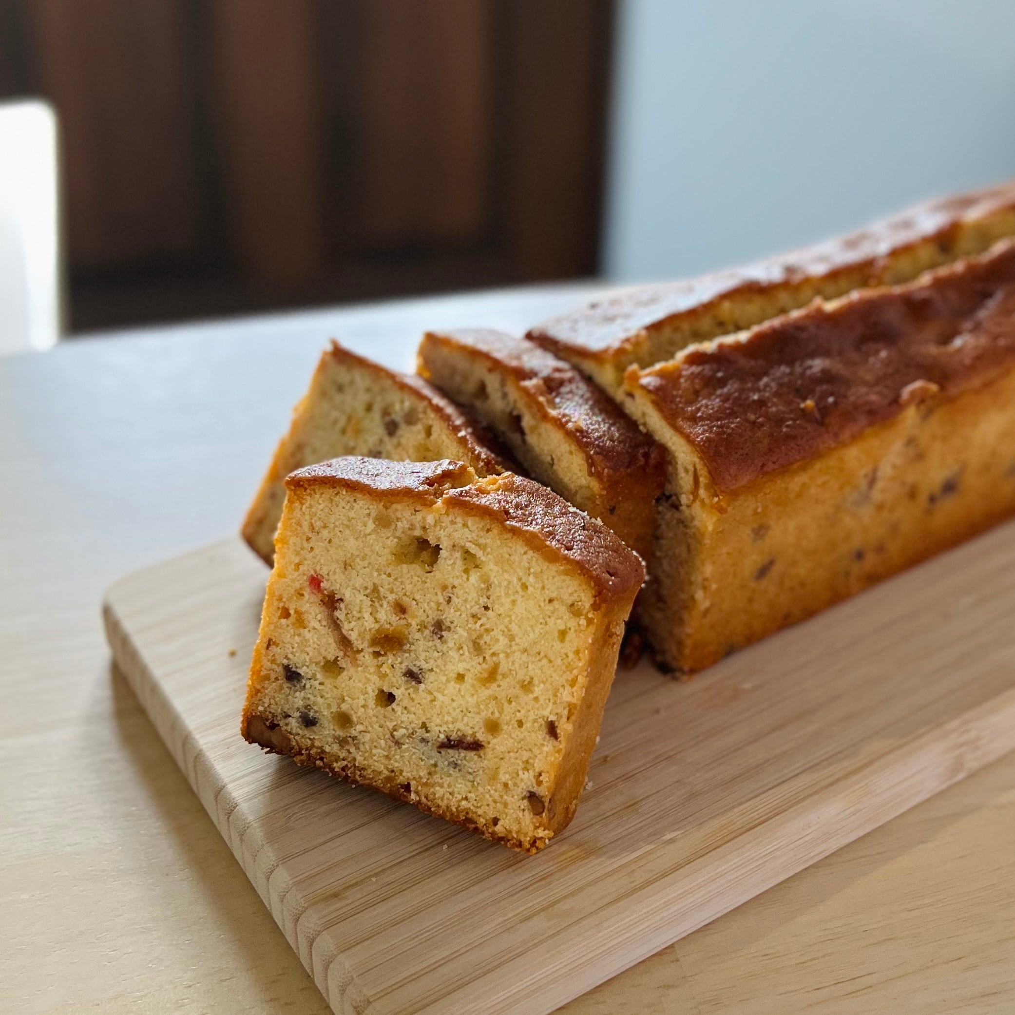 ラム酒やブランデー入りシロップに3ヶ月ほど漬け込んだドライフルーツをくるみと共に、発酵バターを使用したパウンドケーキの生地にふんだんに練り込みました。
